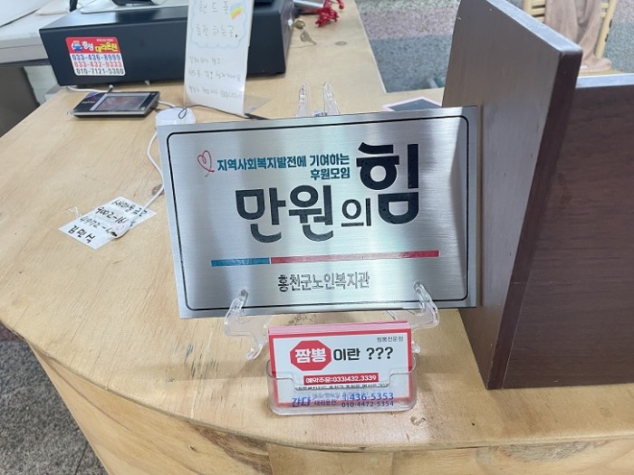 2. 장 소 : 강원 홍천군 홍천읍 영서로 2078 '짬뽕이란'3. 내 용 : '짬뽕이란' 사장님께서 만원의힘 정기후원을 신청해주셔서 만원의힘 현판을 전달해 드렸습니다. 복지관 어르신들을 위한 김민식 사장님의 '만원의 힘' 후원 신청 감사합니다♥4. 담 당 자 : 최보미 과장5. 연 락 처: 033-430-8703
