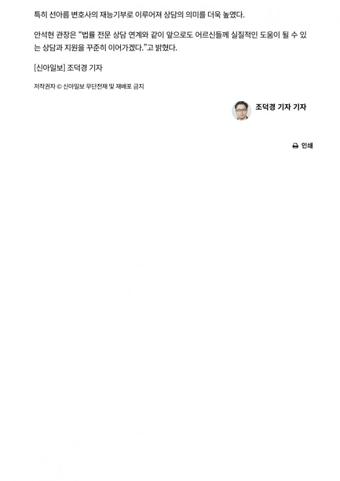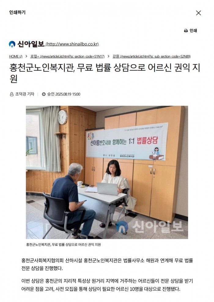 신아일보_홍천군노인복지관, 무료 법률 상담으로 어르신 권익 지원(2025. 8. 19.)