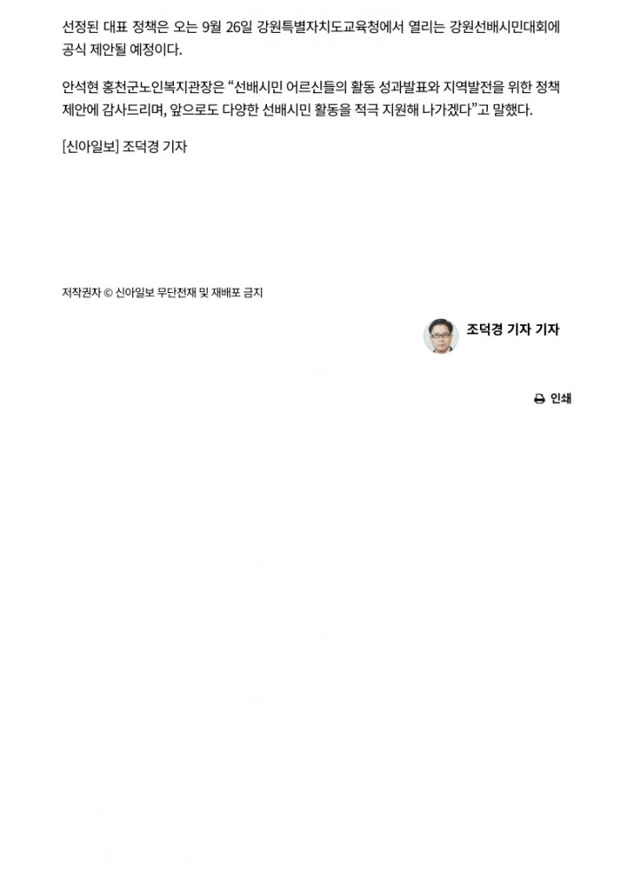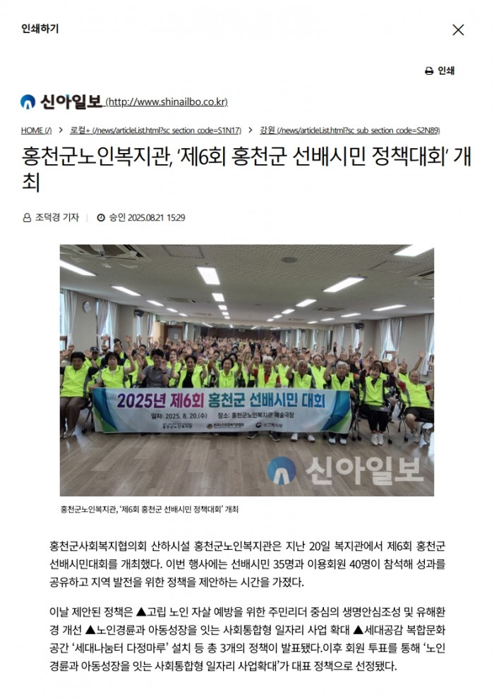 신아일보_홍천군노인복지관, ‘제6회 홍천군 선배시민 정책대회’ 개최(2025. 8. 21.)