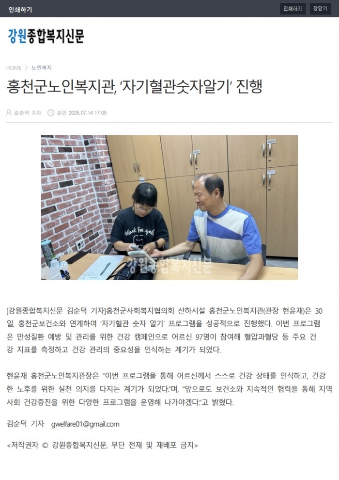 강원종합복지_홍천군노인복지관, ‘자기혈관숫자알기’ 진행(2025. 7. 14.)