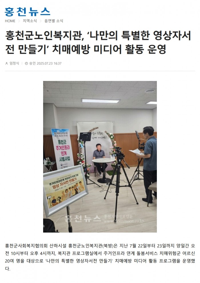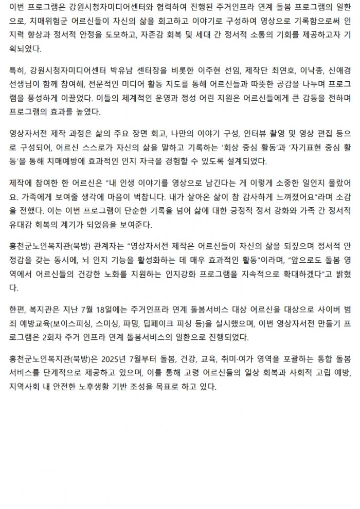 홍천뉴스_홍천군노인복지관, ‘나만의 특별한 영상자서전 만들기’ 치매예방 미디어 활동 운영(2025. 7. 23.)