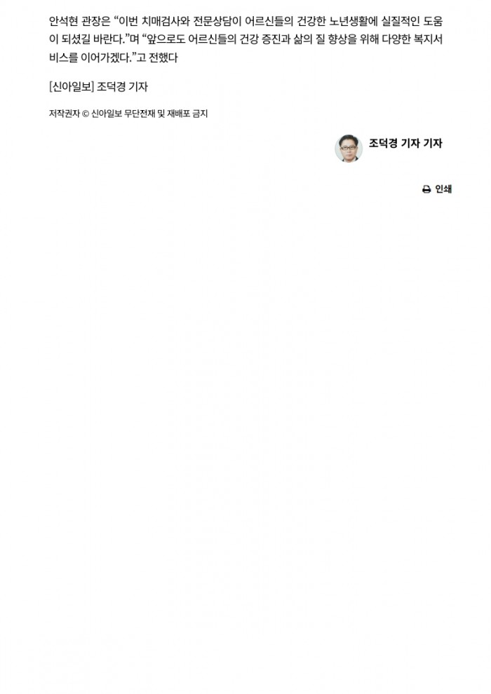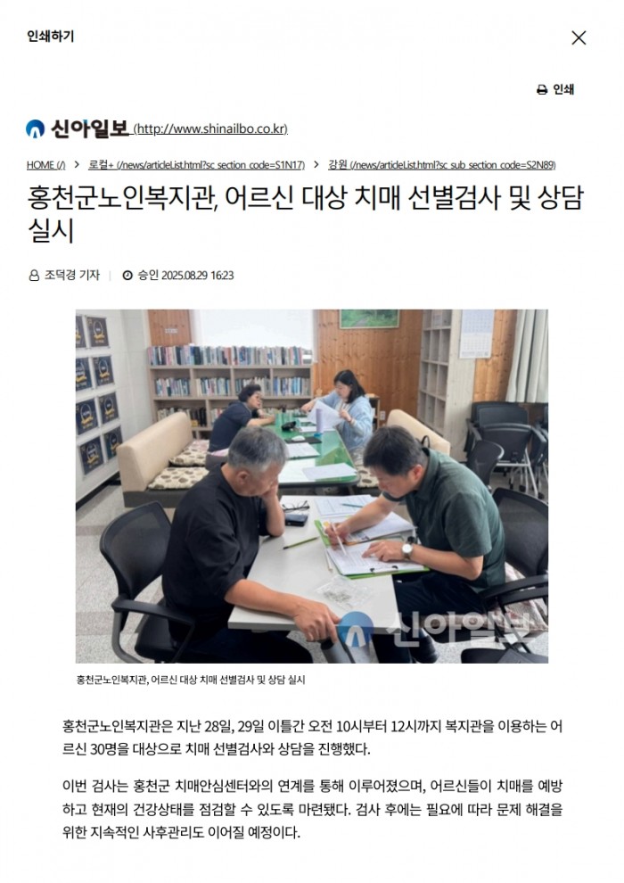 신아일보_홍천군노인복지관, 어르신 대상 치매 선별검사 및 상담 실시(2025. 8. 29.)