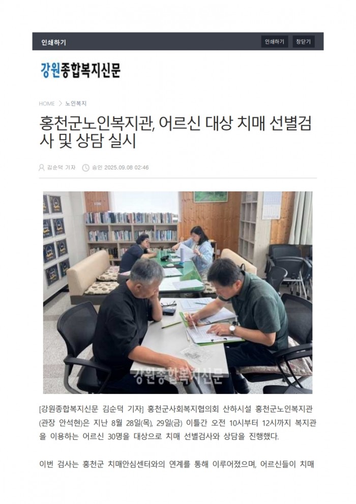 강원종합복지_홍천군노인복지관, 어르신 대상 치매 선별검사 및 상담 실시(2025. 9. 8.)