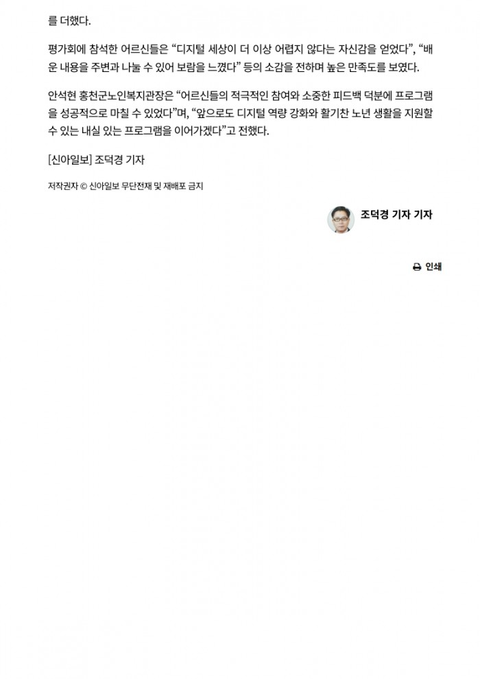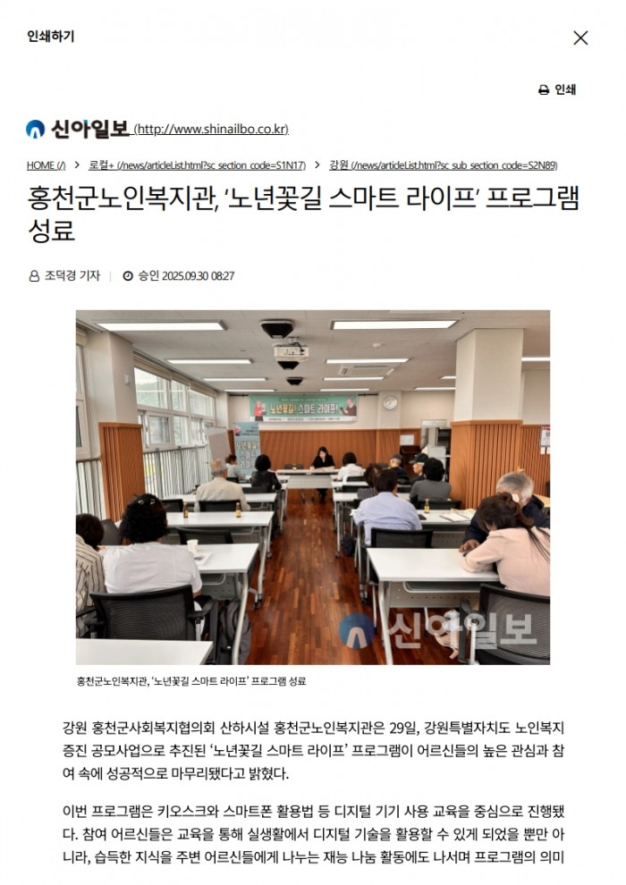 신아일보_홍천군노인복지관, ‘노년꽃길 스마트 라이프’ 프로그램 성료(2025. 9. 30.)