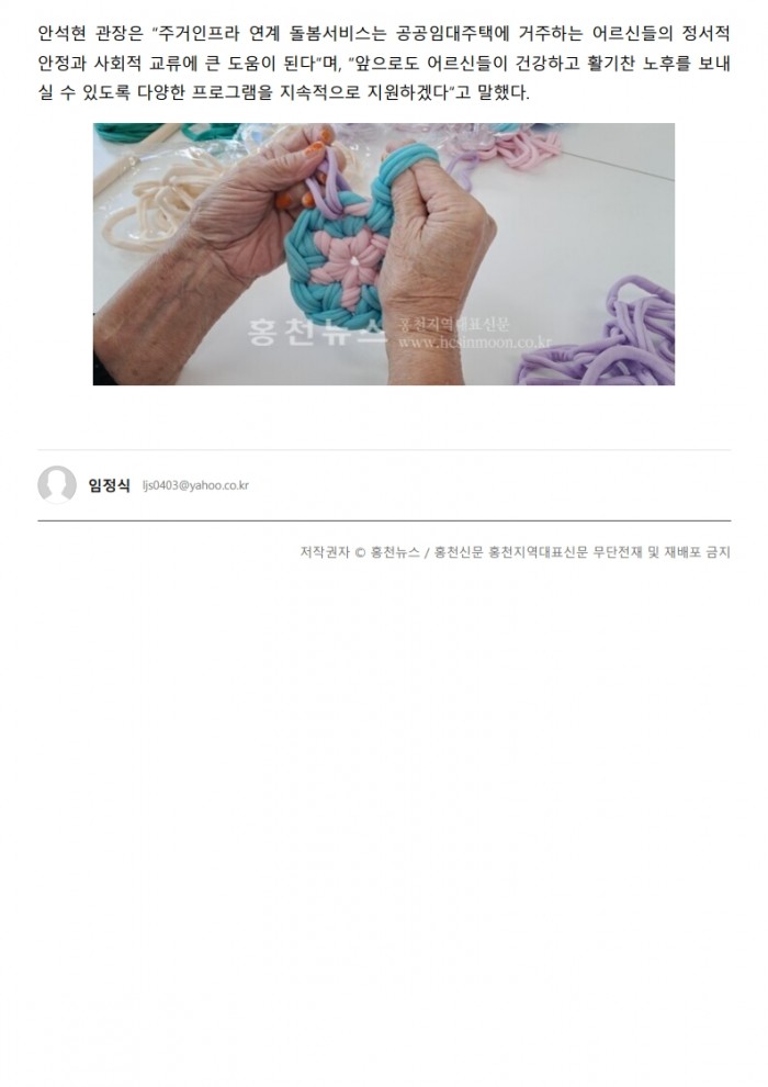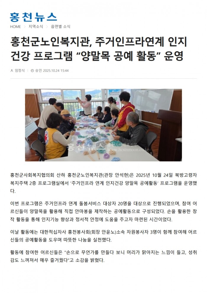 홍천뉴스_홍천군노인복지관, 주거인프라연계 인지건강 프로그램 “양말목 공예 활동” 운영(2025. 10. 24.)