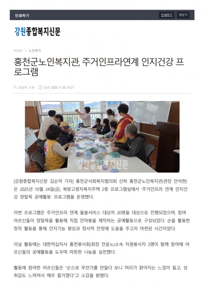 강원종합복지신문_홍천군노인복지관, 주거인프라연계 인지건강 프로그램(2025. 11. 03.)