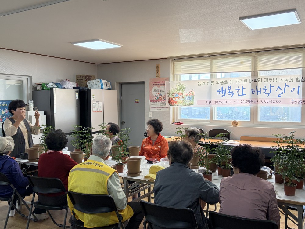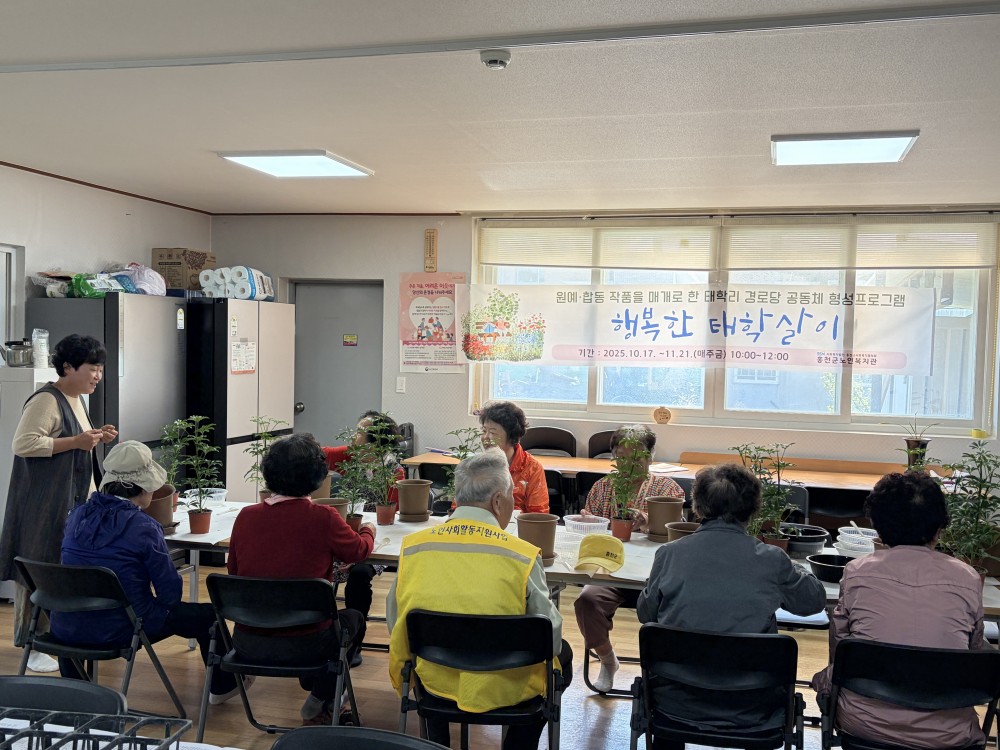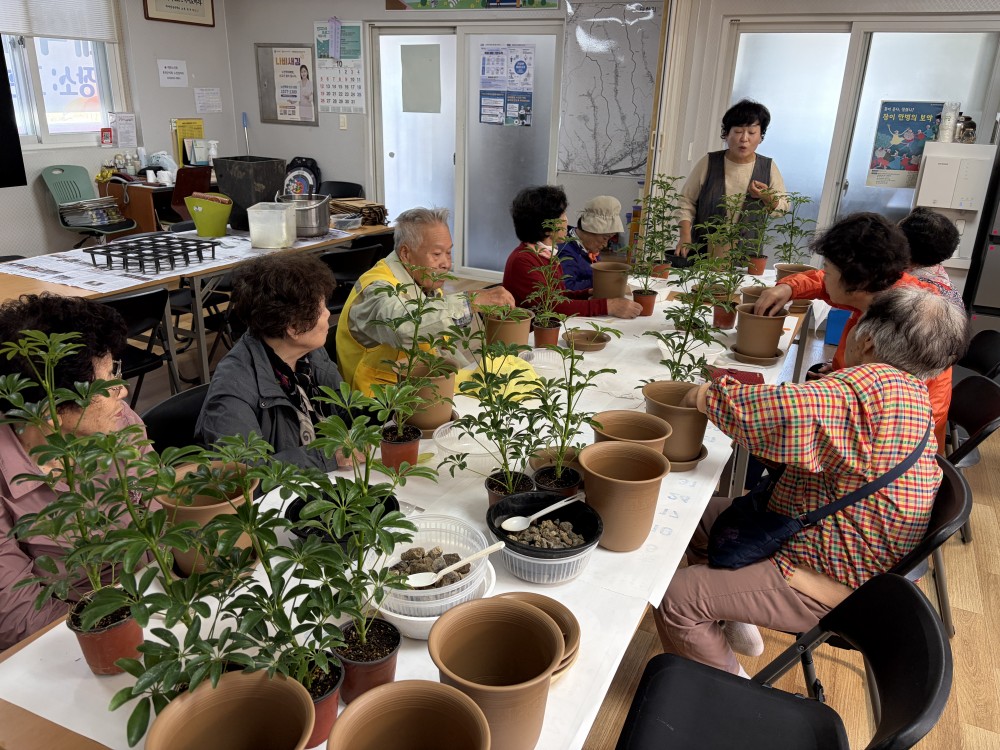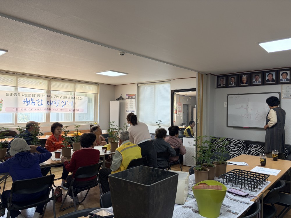 3. 내 용 : 태학리 경로당 어르신들과 복지관 이용회원 어르신이 함께 태학살이 프로그램에 참여하여 '걱정나무 심기' 원예활동을 진행하였습니다.