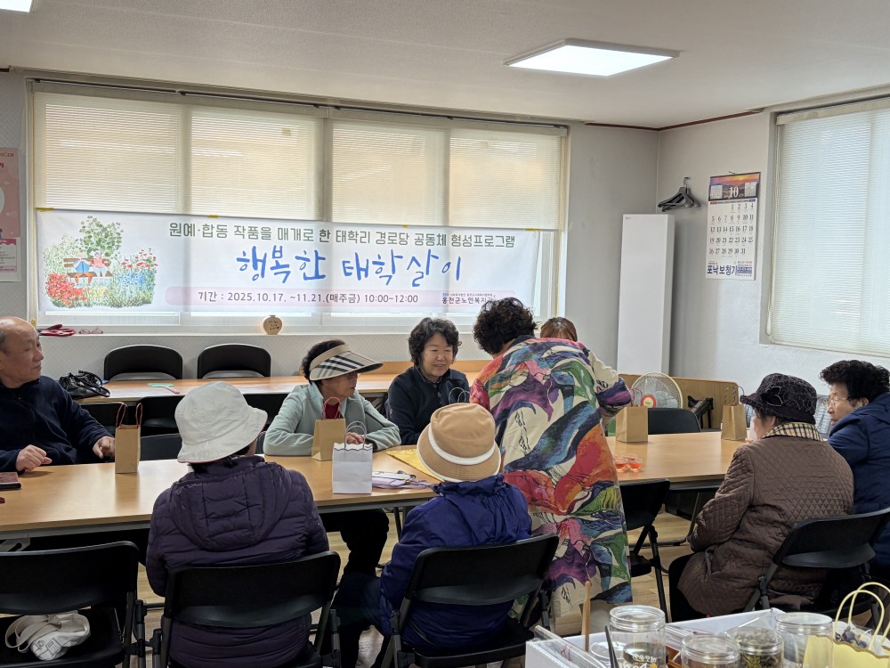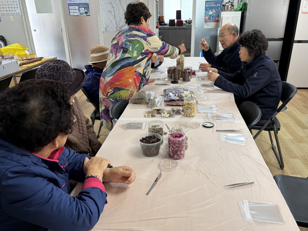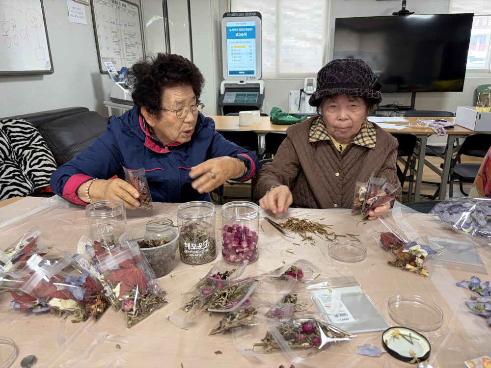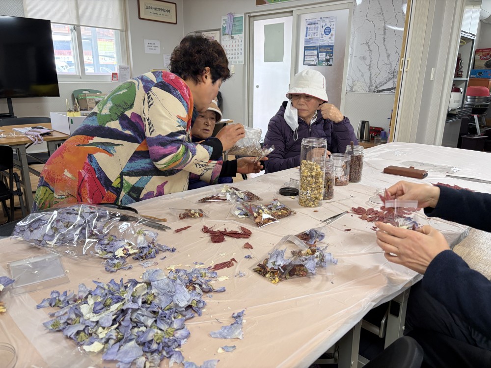 3. 내 용 : 태학리 경로당 어르신들과 복지관 이용회원 어르신이 함께 태학살이 프로그램에 참여하여 '꽃차만들기' 원예활동을 진행하였습니다.