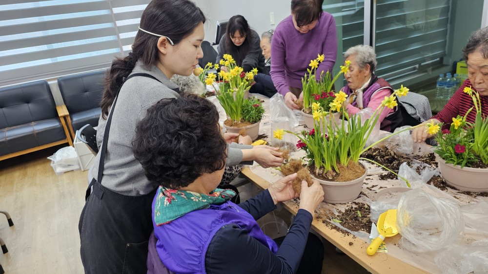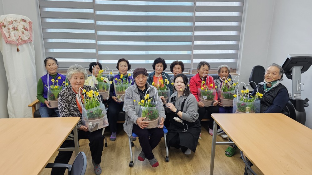 노인맞춤돌봄서비스 어울림프로그램으로 화촌에 거주하고 계신 10명의 대상자와 원예활동(화분심기)을 진행하였습니다.