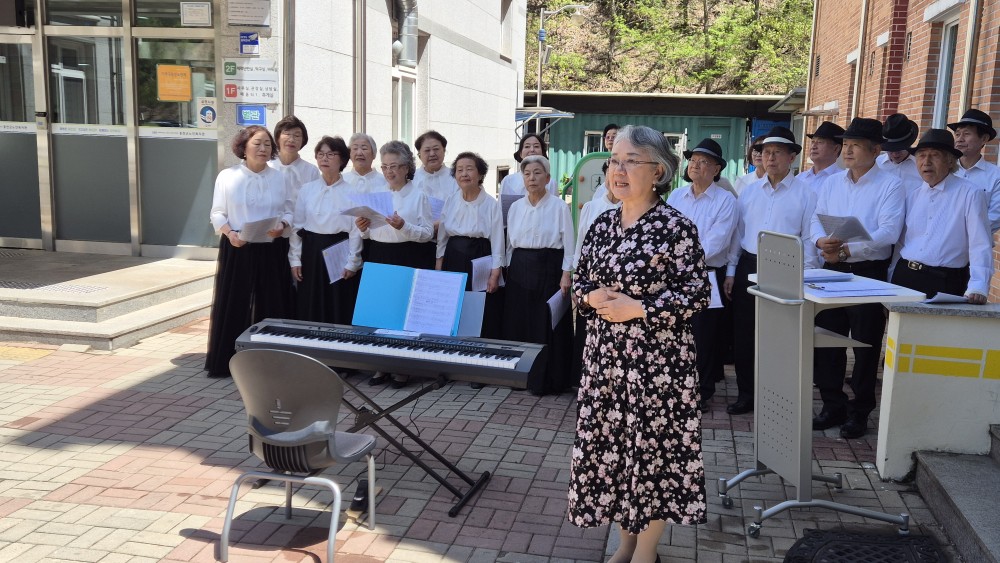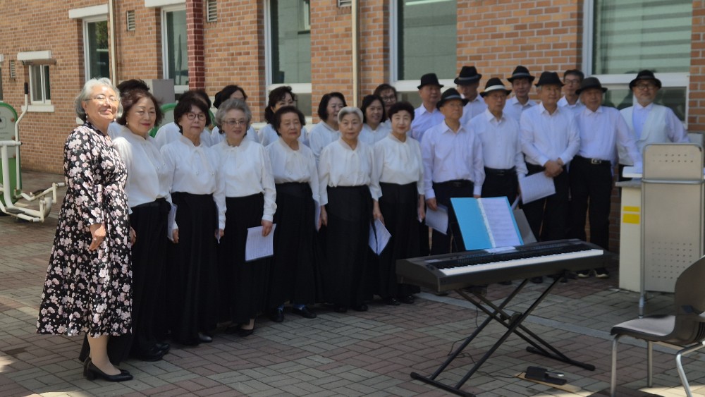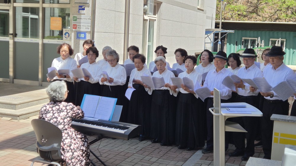 홍천시니어 예술단 가곡단에서 작은음악회를 별관 앞마당에서 진행하였습니다. 경로당 및 복지관 참여자 50여명과 함께 가곡과 동요로 함께하는 시간을 가졌습니다.