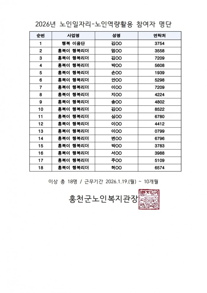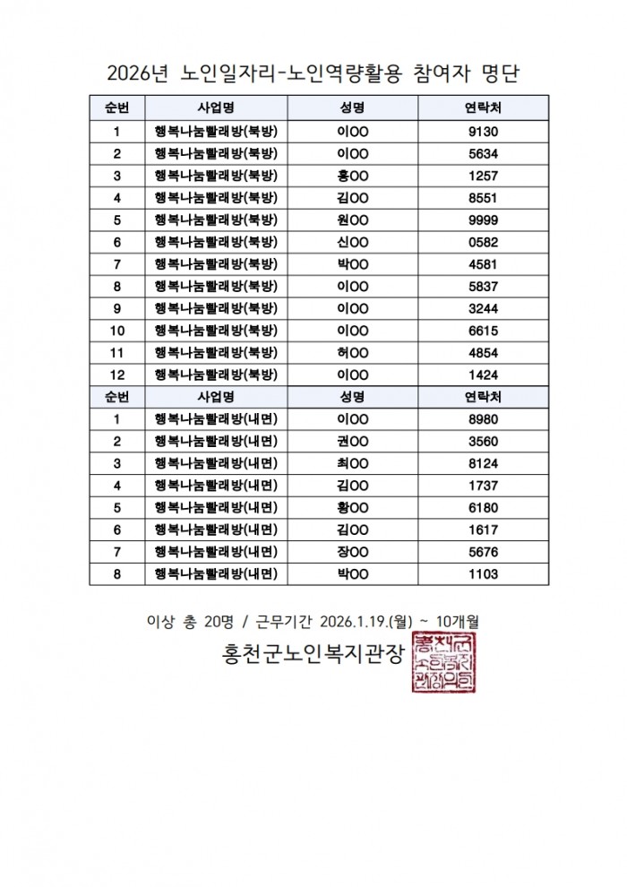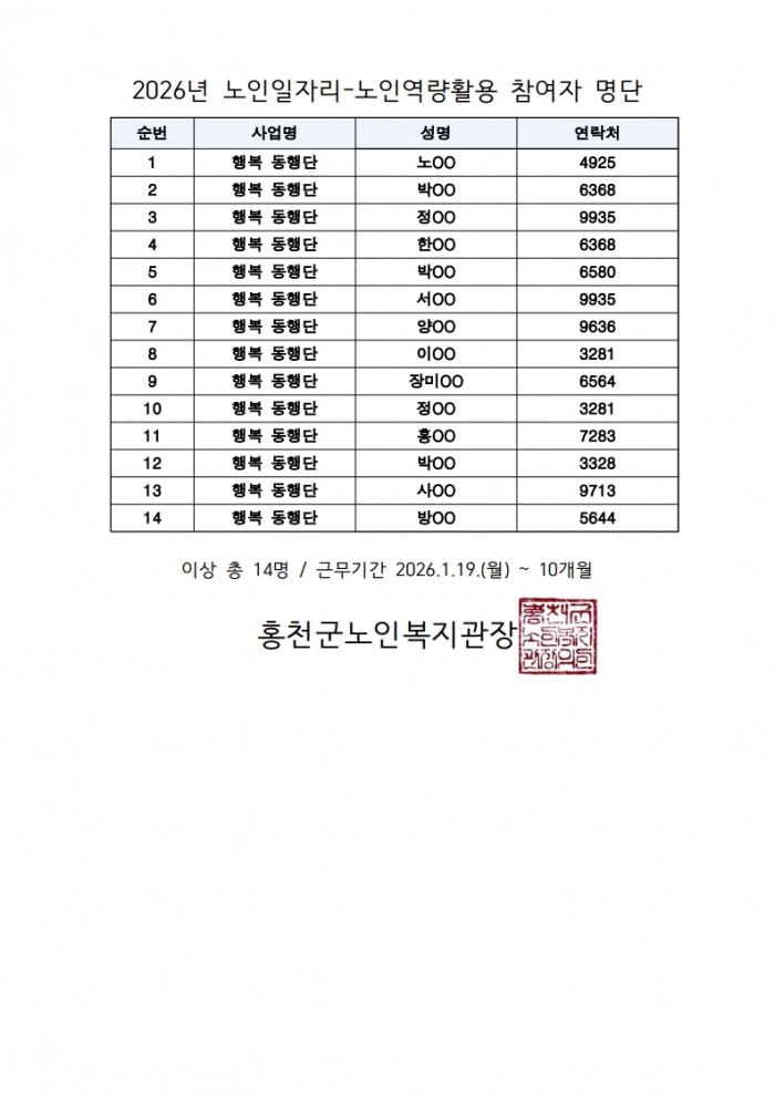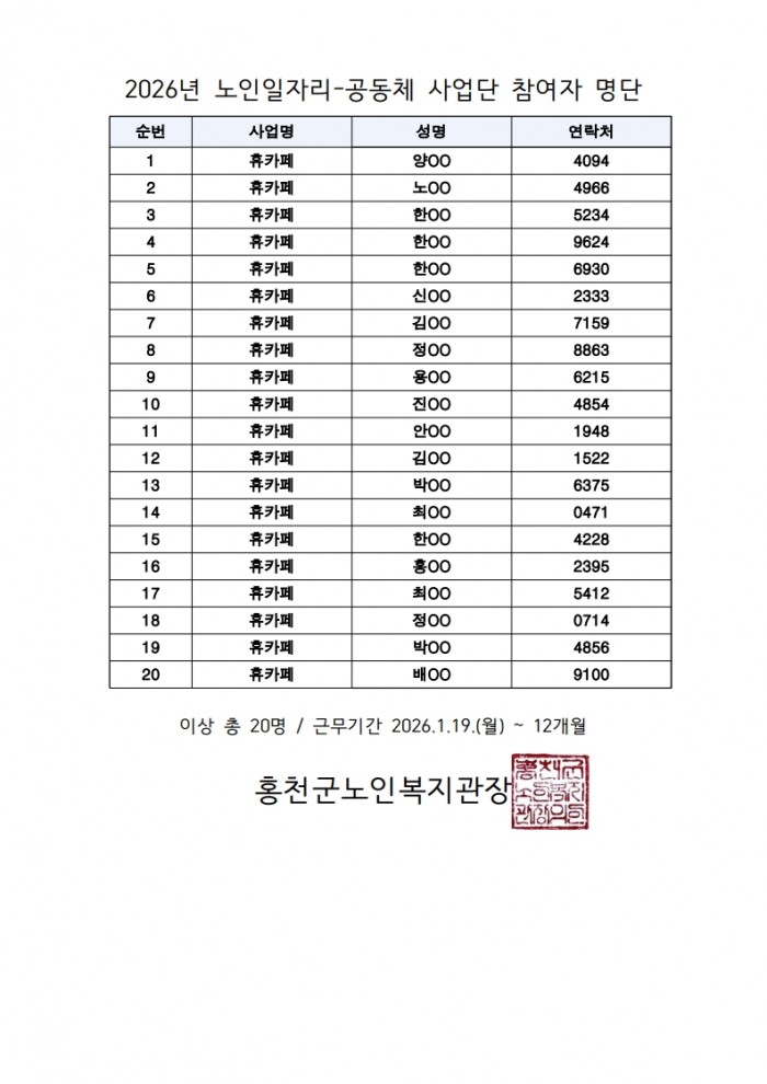 2026년 노인일자리 및 사회활동지원사업 참여자 확정 게시 (역량활용 빨래방/ 행복 이음단/ 행복 동행단) (공동체 휴카페)