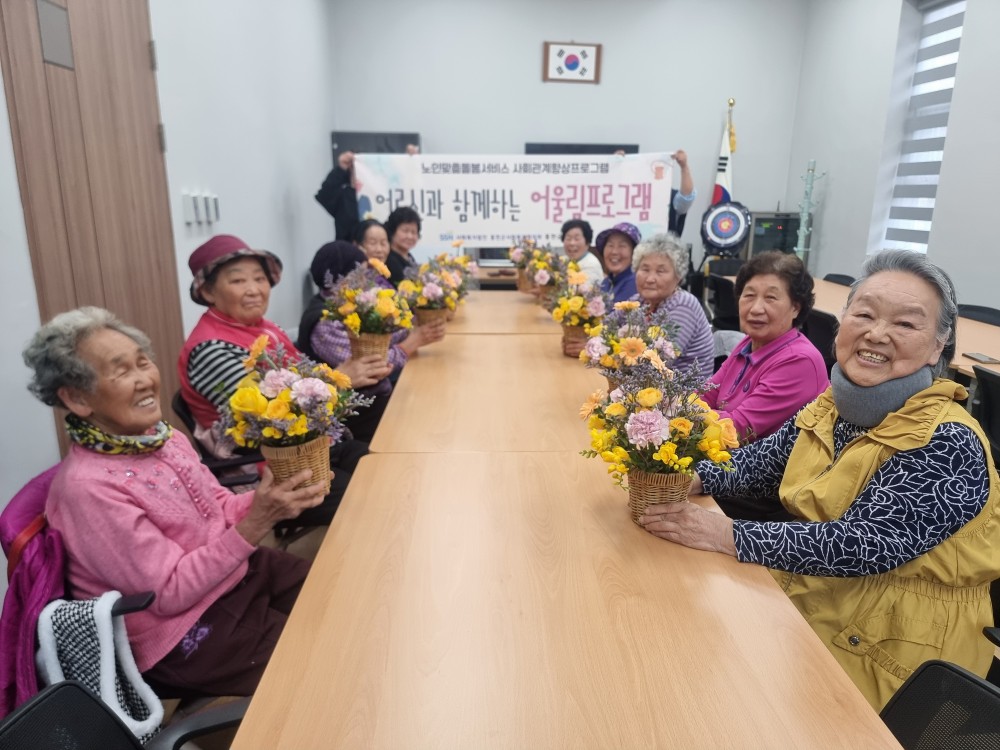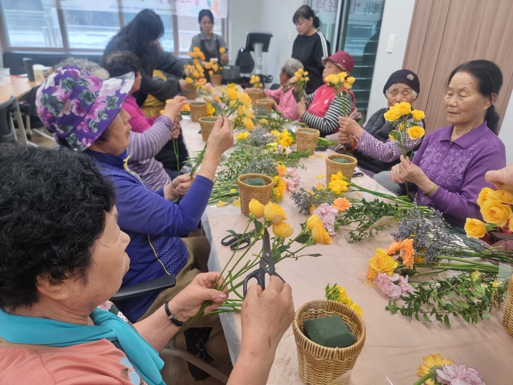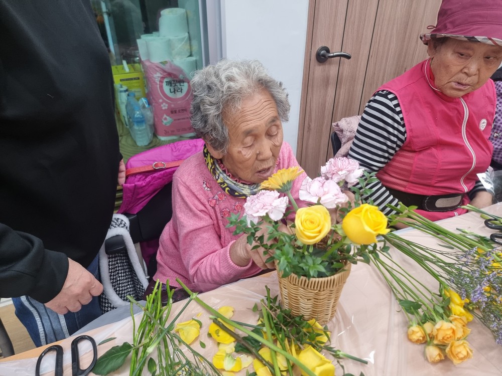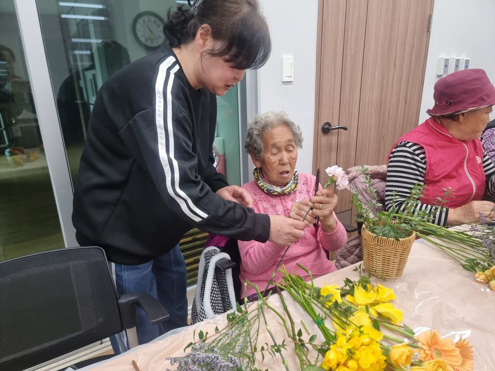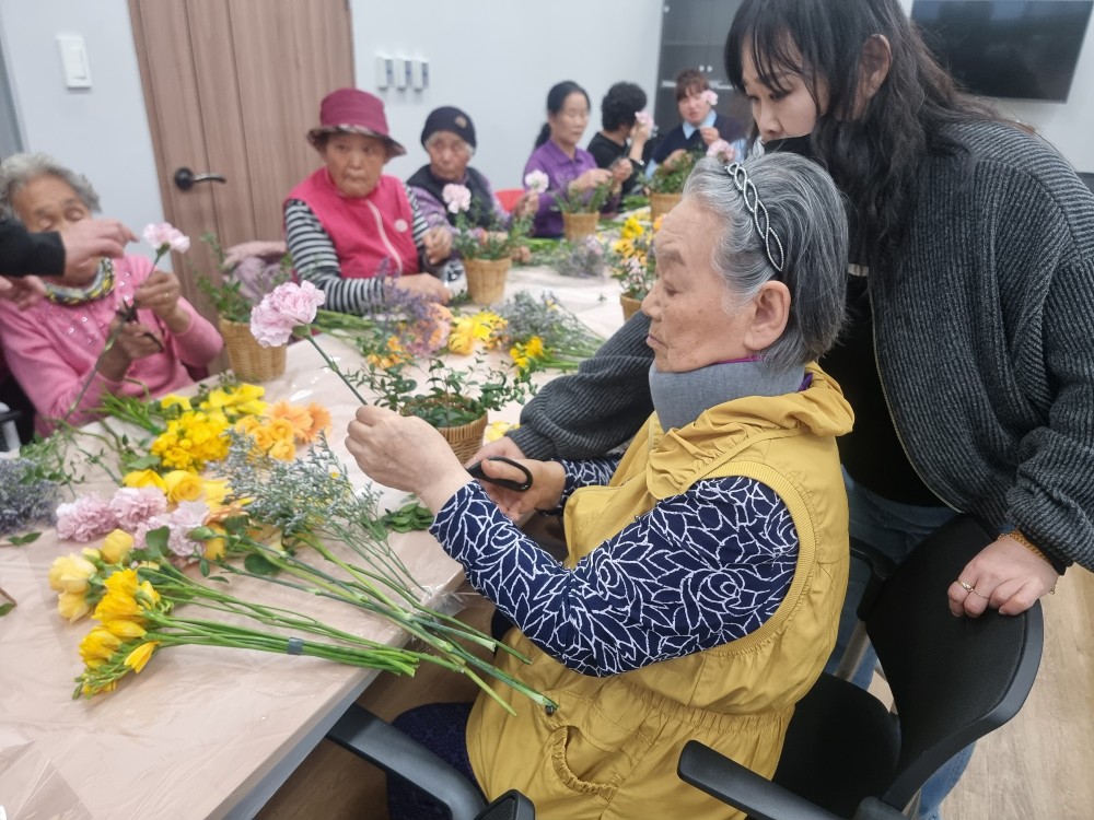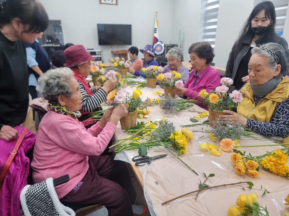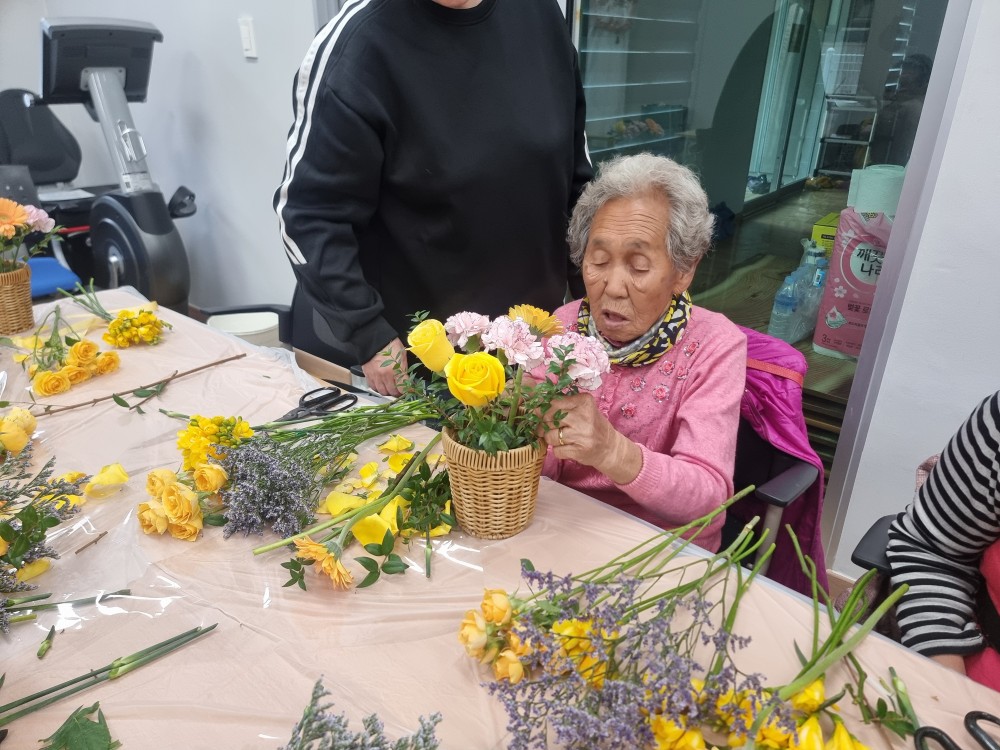 3. 내 용 : 노인맞춤돌봄서비스 어울림프로그램으로 화촌면에 거주하고 계신 10명의 대상자와 월예활동(꽃꽃이)을 진행하였습니다.