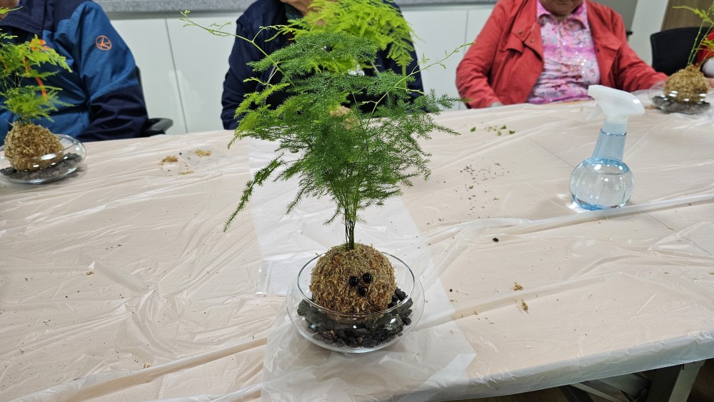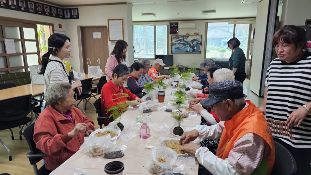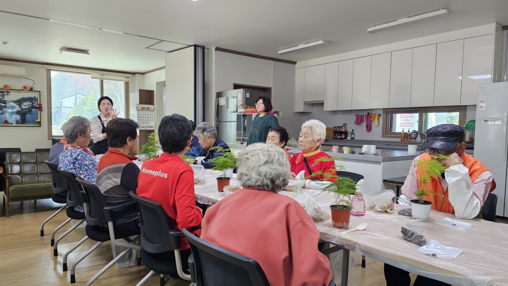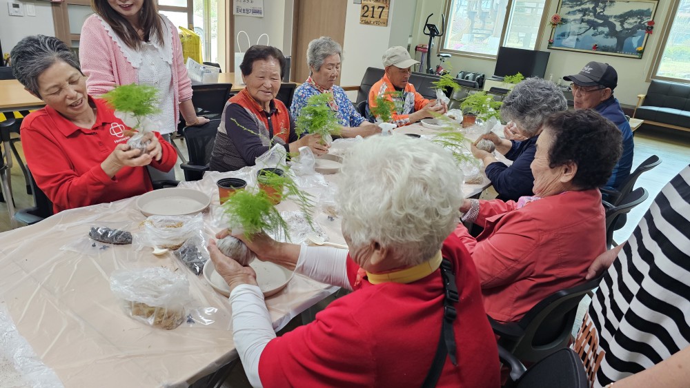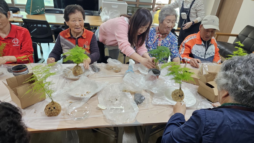 노인맞춤돌봄서비스 어울림프로그램으로 화촌면 야시대리에 거주하고 계신 10명의 대상자와 원예활동(이끼볼만들기)을 진행하였습니다.