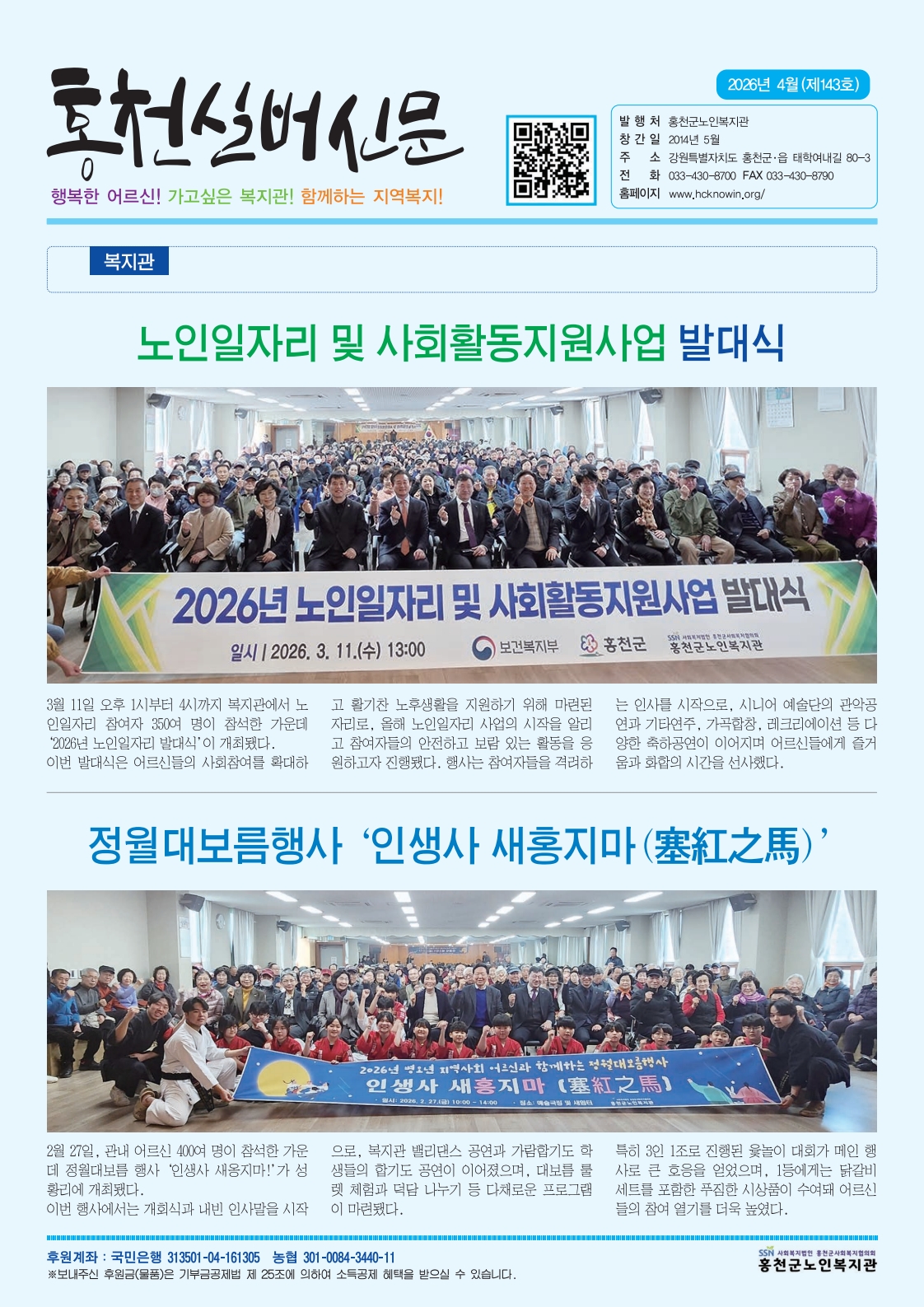 행복한 어르신, 가고싶은 복지관, 함께하는 지역복지 홍천군노인복지관!